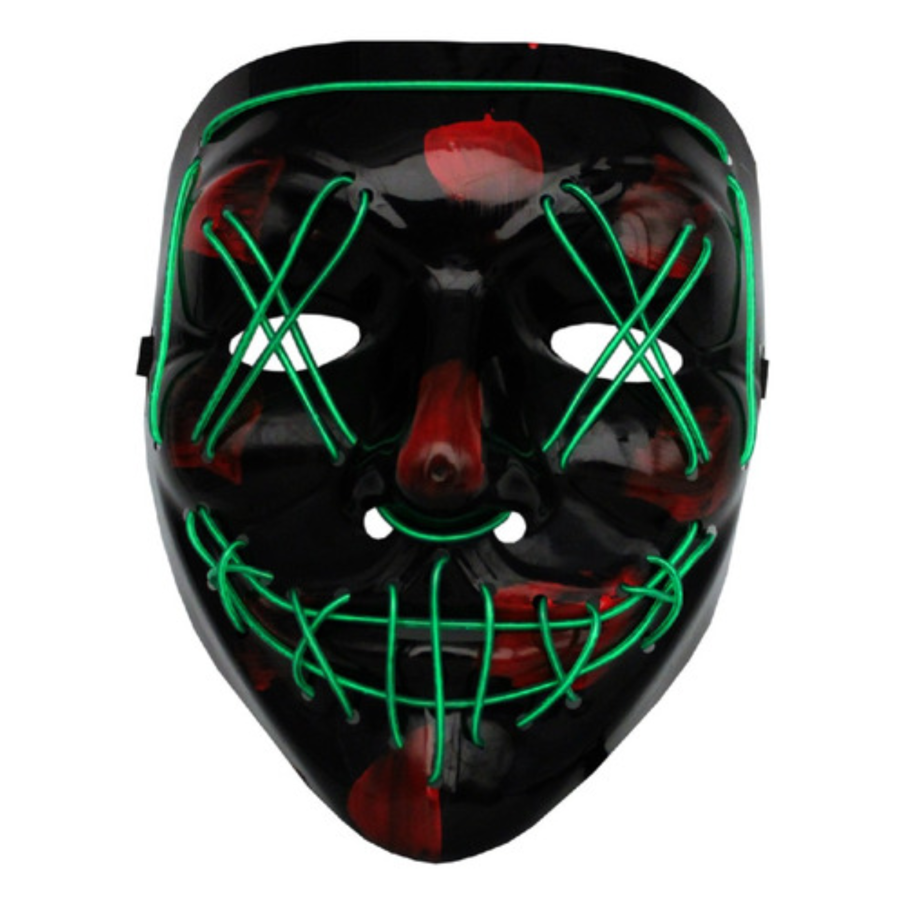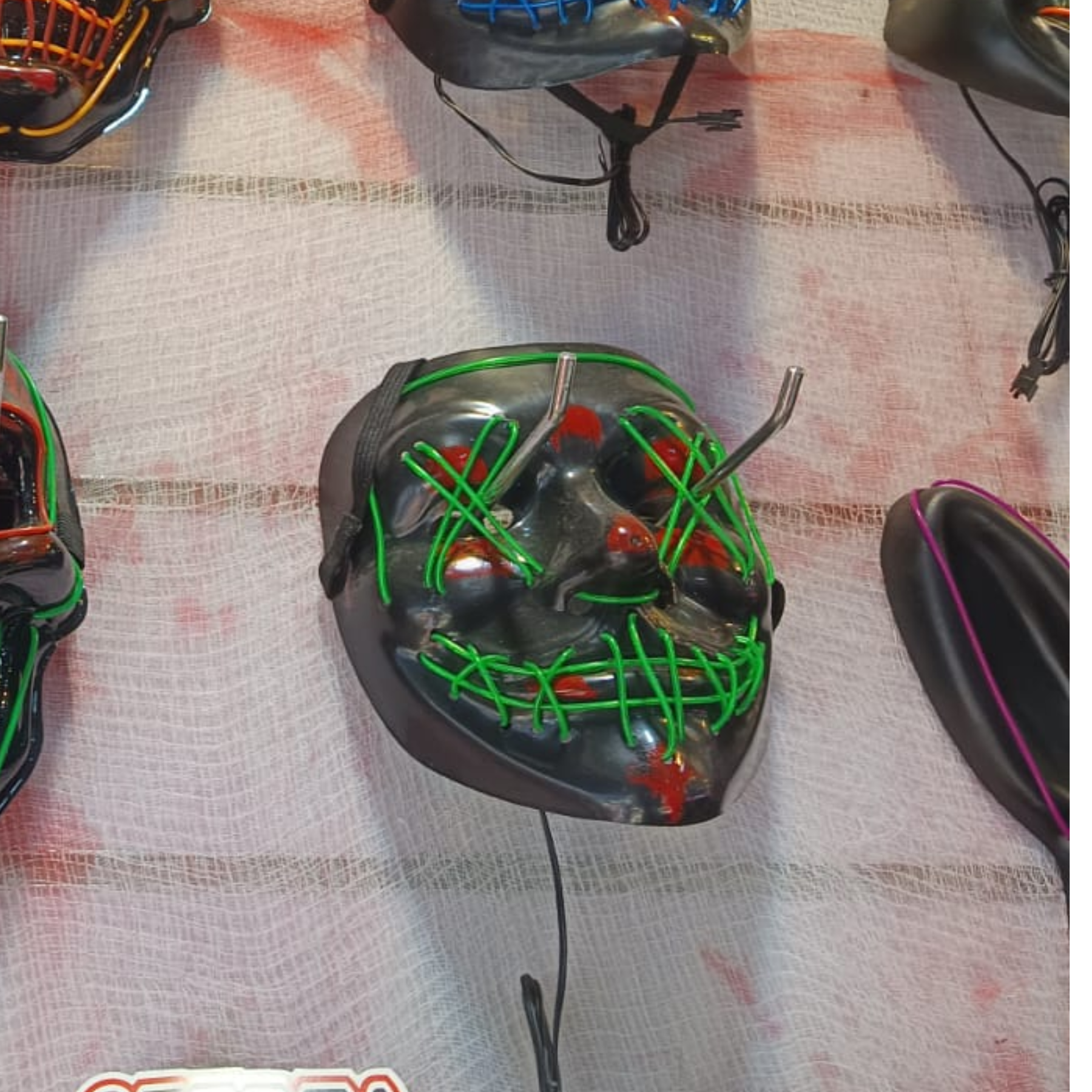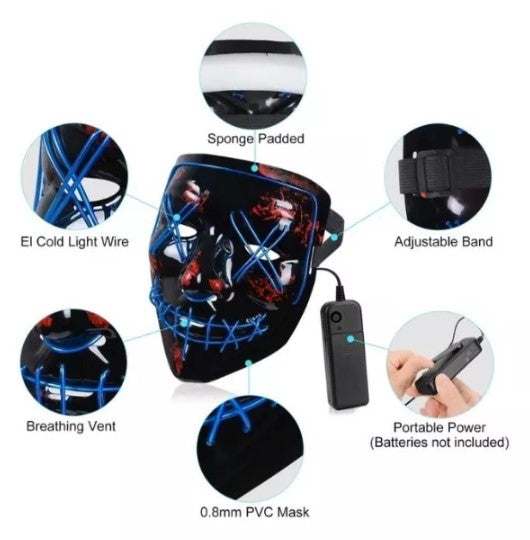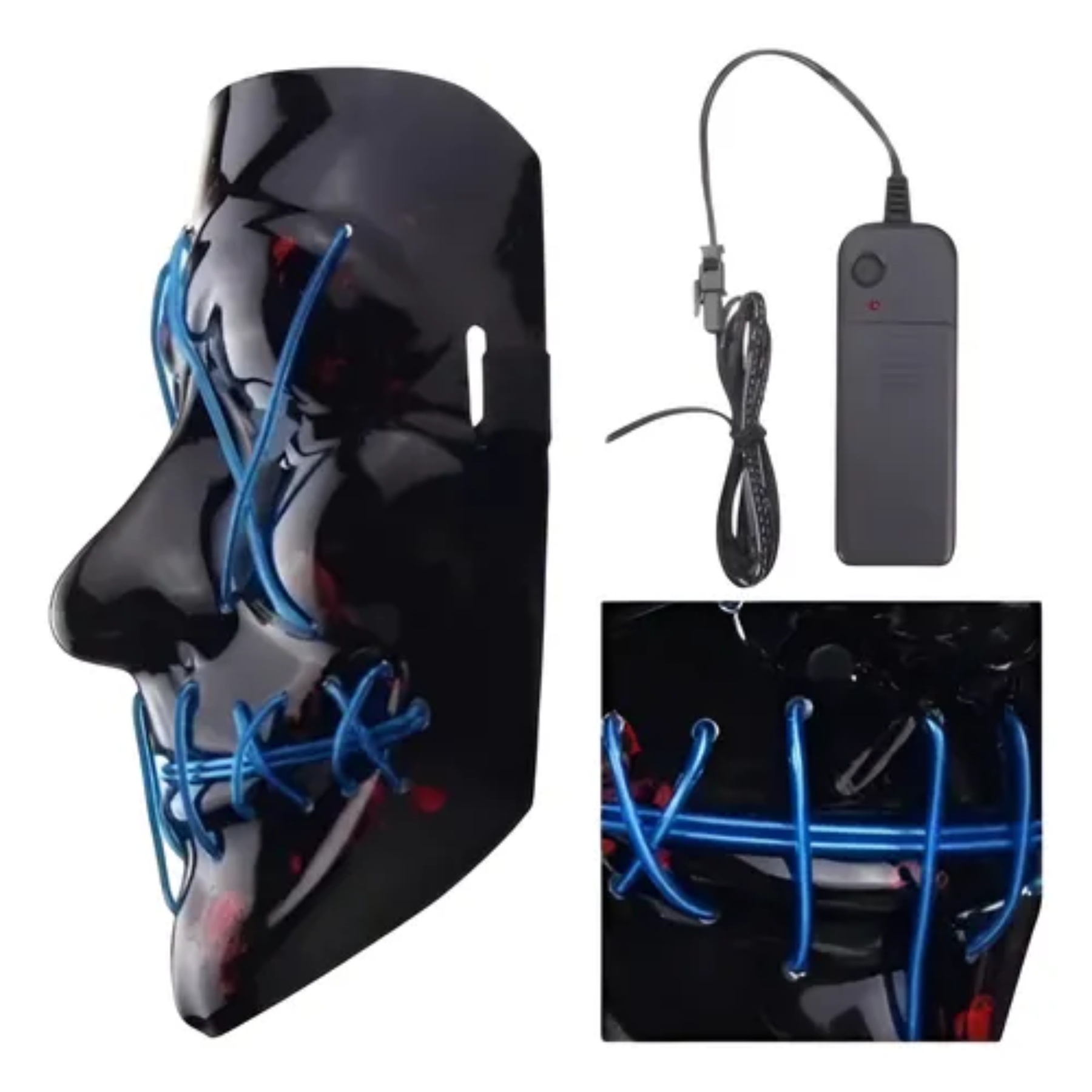 DescripciónMÁSCARA DE LUZ LED LA PURGA HALLOWEEN COLORES DE CALIDAD :)Es una máscara de plástico que se ilumina con luces de colores, creando un efecto espectacular en la oscuridad.Puedes elegir entre diferentes modelos y colores, de acuerdo al estilo que más te guste. Funciona con pilas y tiene un control remoto para cambiar el modo de iluminación. Puedes hacer que las luces parpadeen, se atenúen o se mantengan fijas.Es cómoda y fácil de usar, ya que se ajusta con una cinta elástica a la cabeza.Cuenta con 4 modos de iluminación LED: Luz fija, flash lento, flash rápido, apagado.¡Es el complemento ideal para lograr tu disfraz de Halloween y causar sensación entre tus amigos!ESPECIFICACIONES:• Material: PVC + Cable.• Longitud del cable: 100 cm.• Método de uso: Clip (clip de controlador).• Peso: 102 grs.• Área de cobertura: Cara completa.• Batería adjunta, botón de encendido/apagado.• Alimentación del mando: 2 Pilas AA de 1,5 V (no incluida).• Dimensiones del paquete : 22,9 x 18,3 x 9,2 cm; 100 gramos.